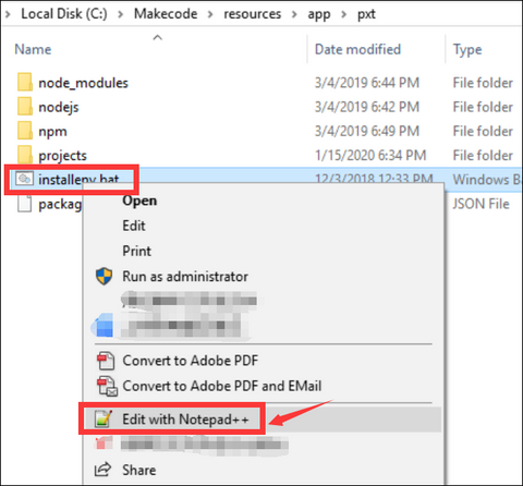2.Enter this folder to locate the installenv.bat file【Path:C:\Makecode\resources\app\pxt】as shown below.