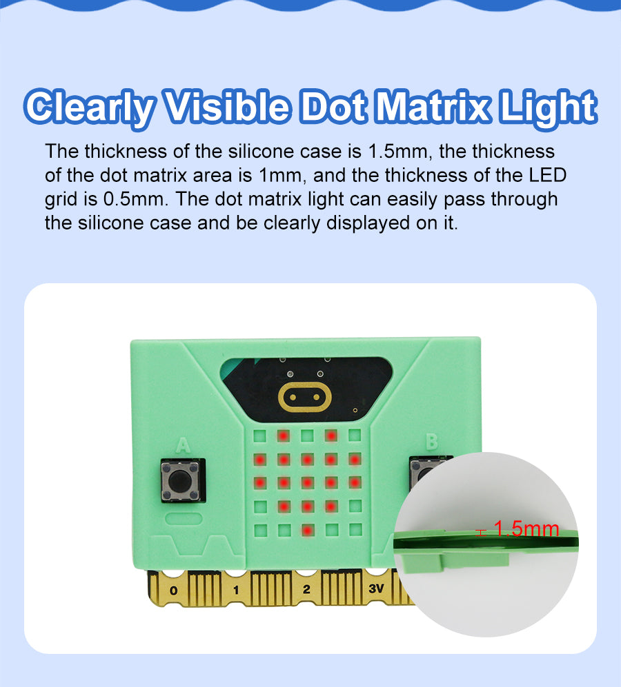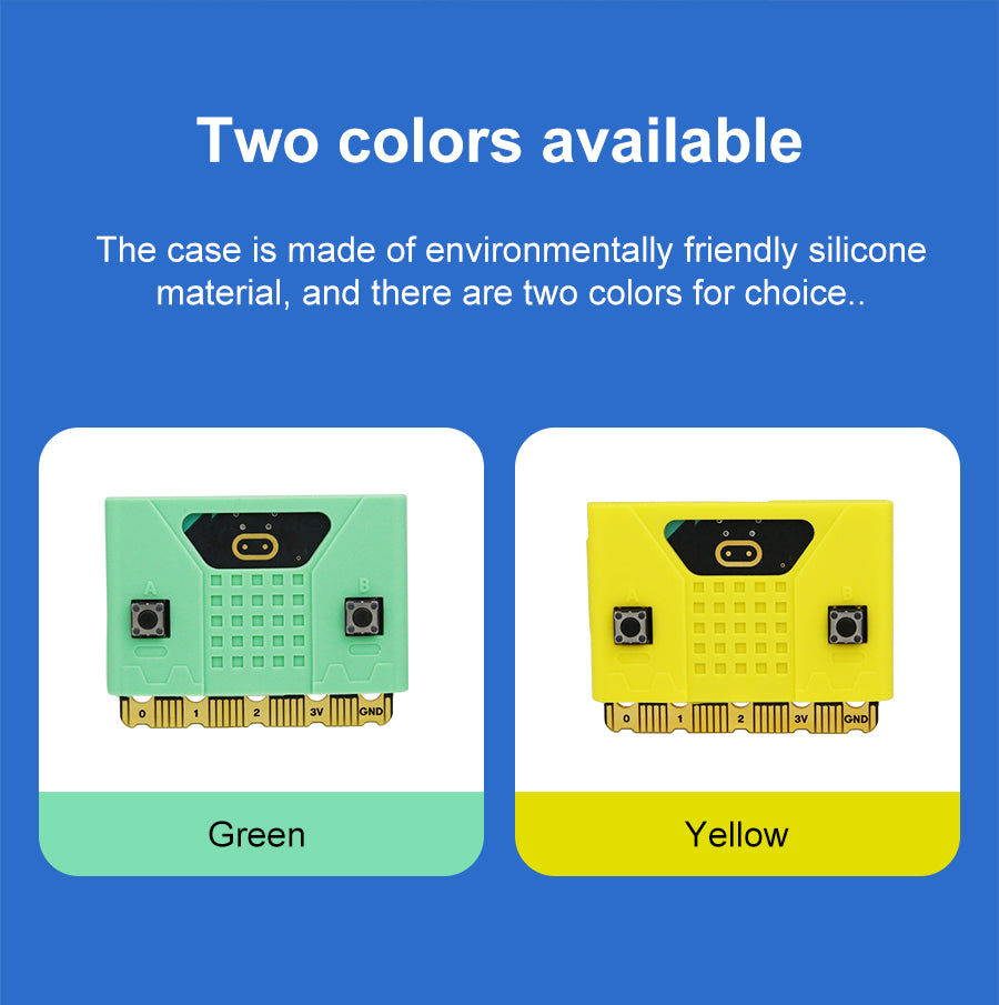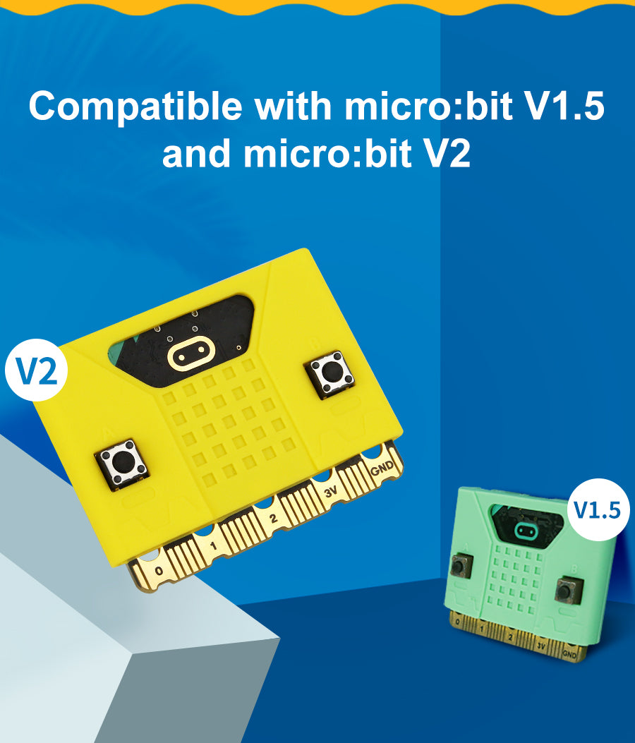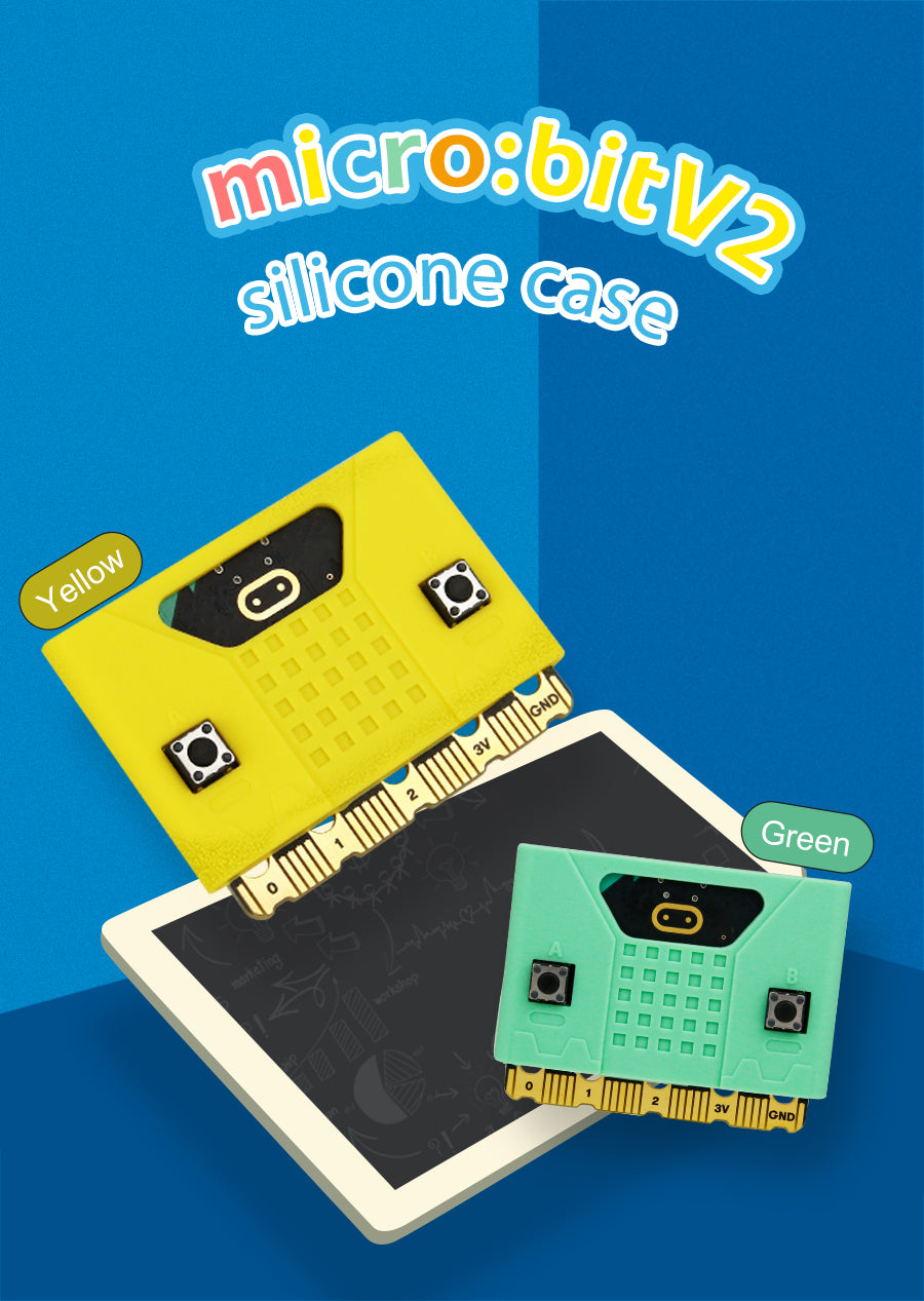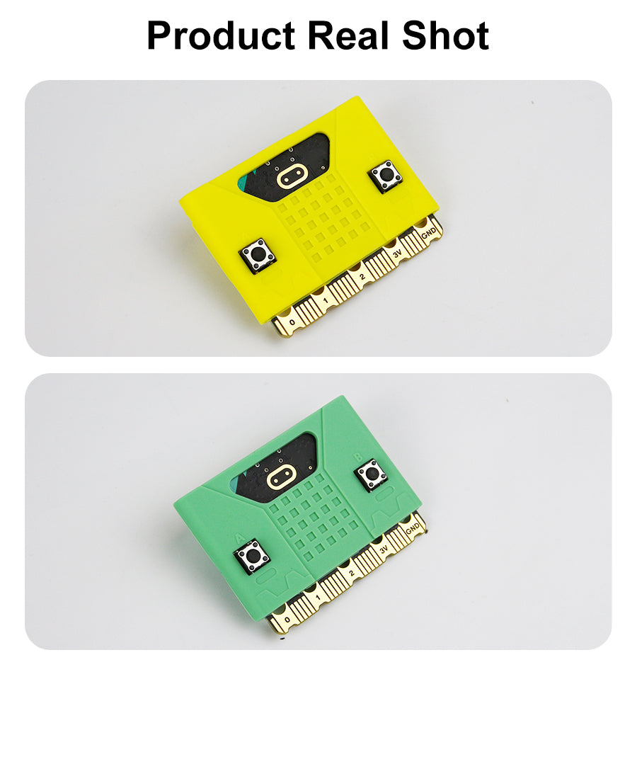 This new Micro:bit cute silicone case is compatible with Micro:bit V1 and V2 board. All holes are specially designed for the 2nd-generation Micro:bit board, which does not affect speaker, touch logos and microphone. We also designed a thinner part on the case for 5*5 dot matrix and added the silk screen of A B button. Users can install it on the extension boards or robotics, which not only protects Micro:bit board, but also makes your works more attractive to others.