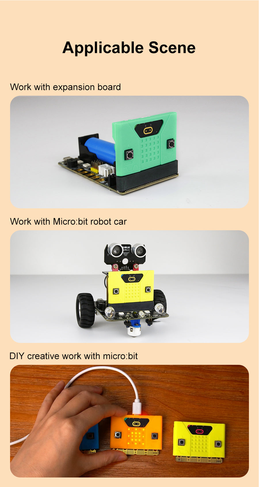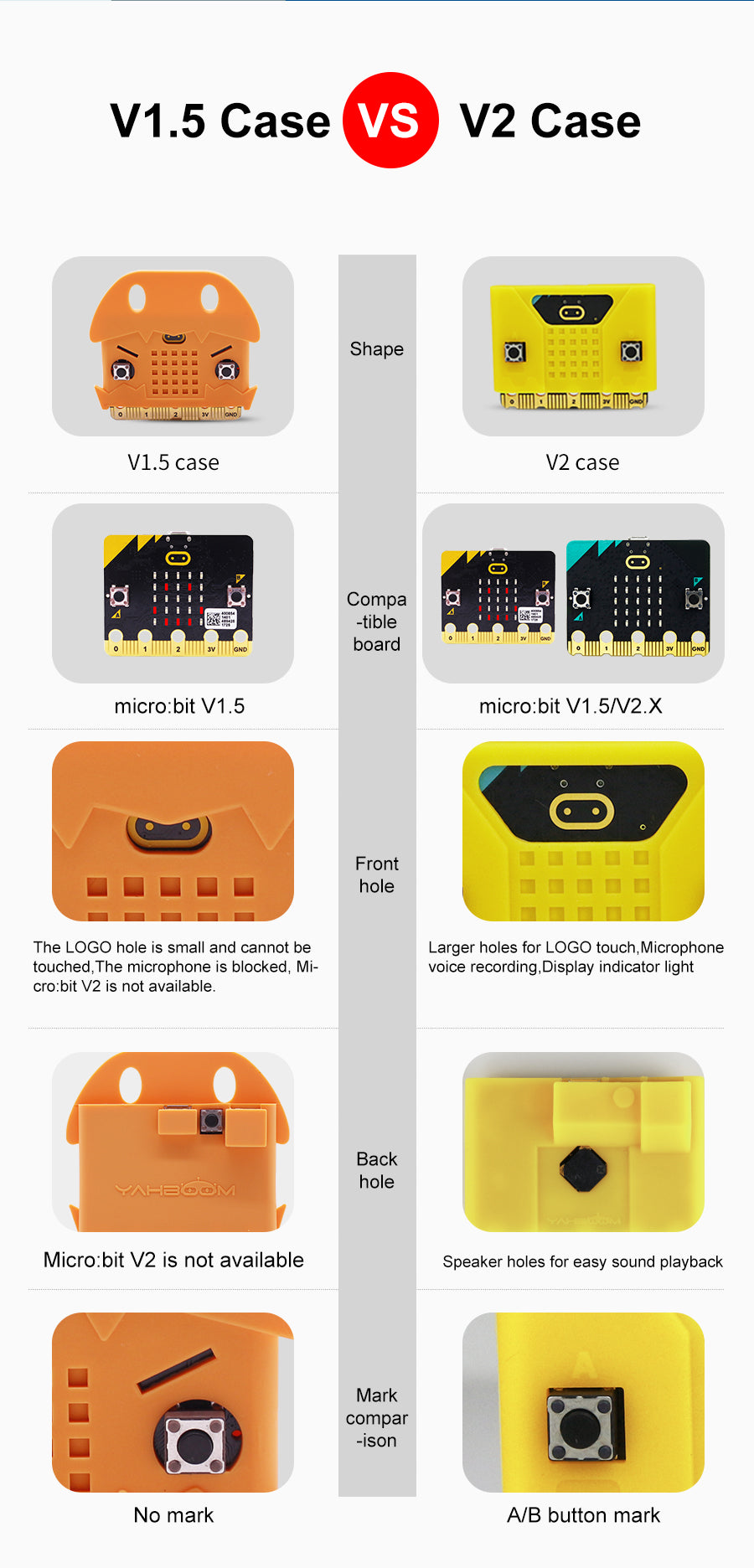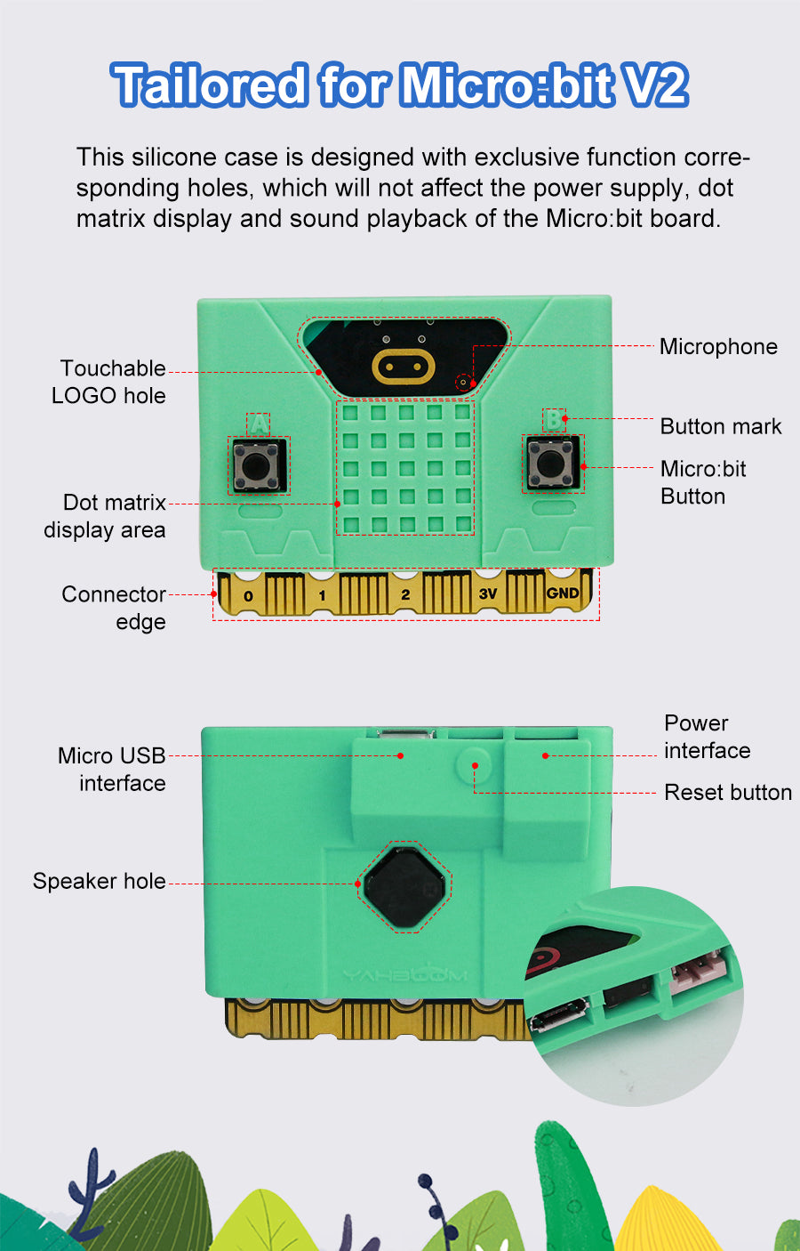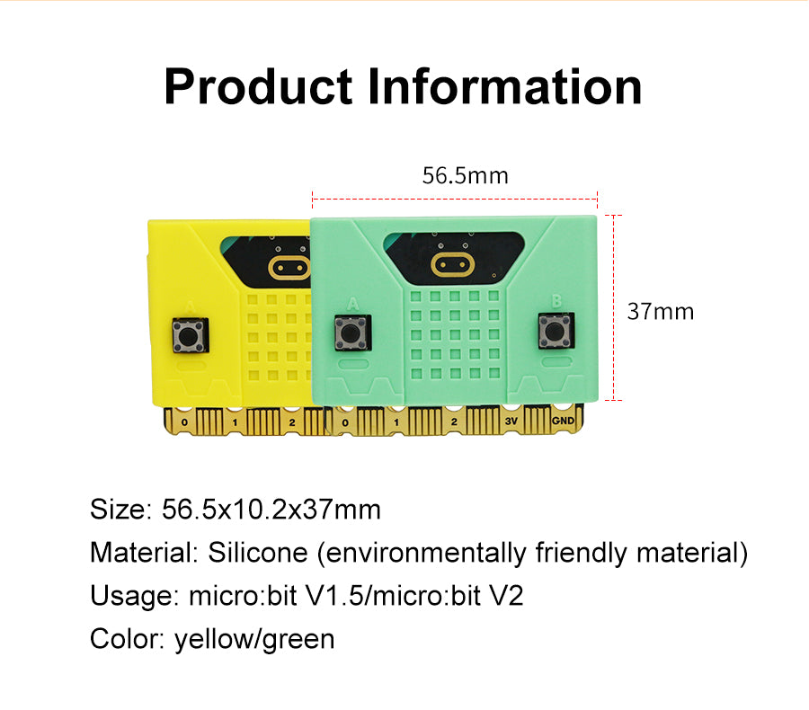 This new Micro:bit cute silicone case is compatible with Micro:bit V1 and V2 board. All holes are specially designed for the 2nd-generation Micro:bit board, which does not affect speaker, touch logos and microphone. We also designed a thinner part on the case for 5*5 dot matrix and added the silk screen of A B button. Users can install it on the extension boards or robotics, which not only protects Micro:bit board, but also makes your works more attractive to others.