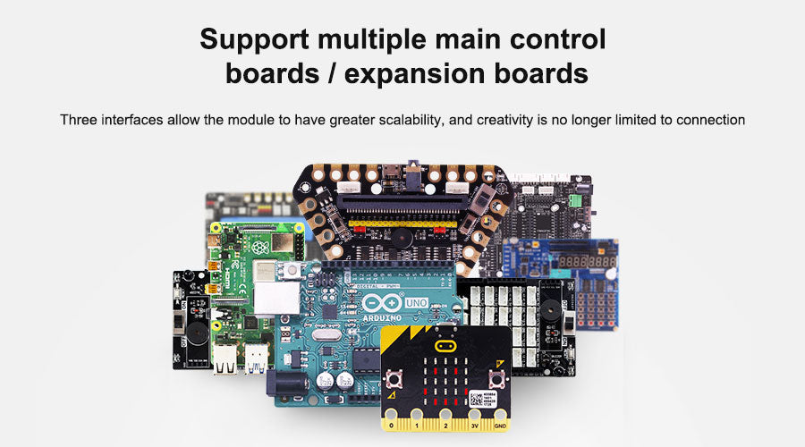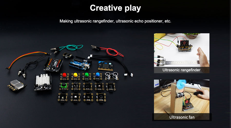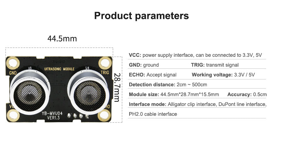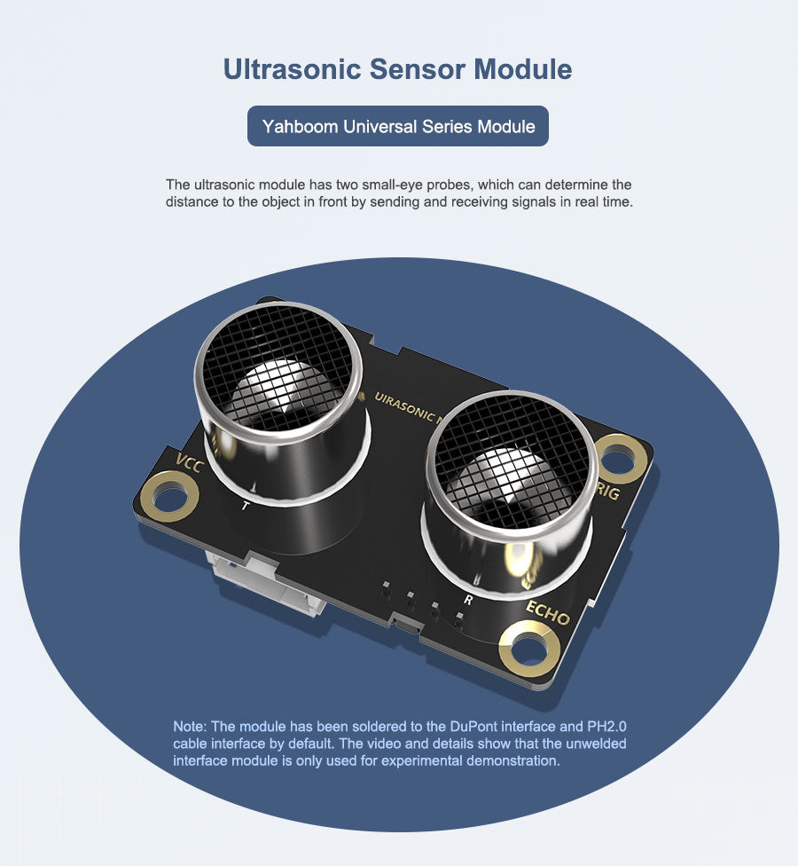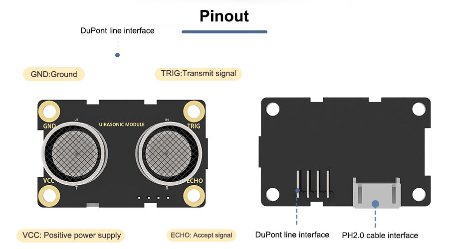 The ultrasonic module possess a transmitting probe and a receiving probe that can determine the distance of the object in front by sending and receiving signals. The four interfaces VCC, GND, ECHO, and TRIG all use the alligator clip connection, which can be directly connected to the micro:bit board or the alligator clip expansion board to support graphical programming. 4 Pins and PH2.0 interface are designed on the module, users can connect the DuPont line or cable for other experiments. It can be used to make creative experiments such as Rangefinder and DIY accordion.